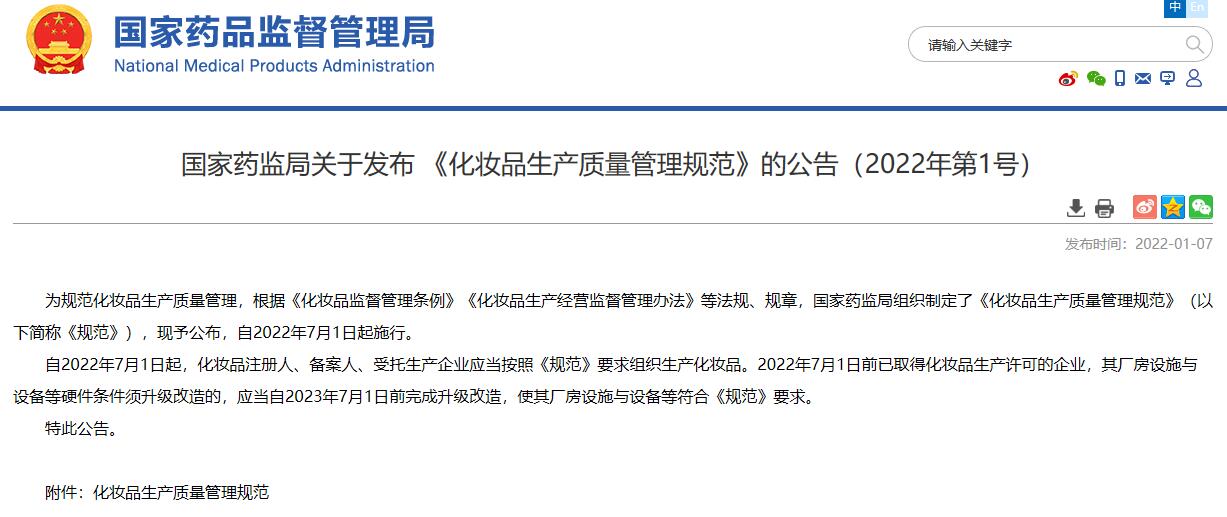 國家藥監局關于發布 《化妝品生產質量管理規范》的公告(2022年第1號)