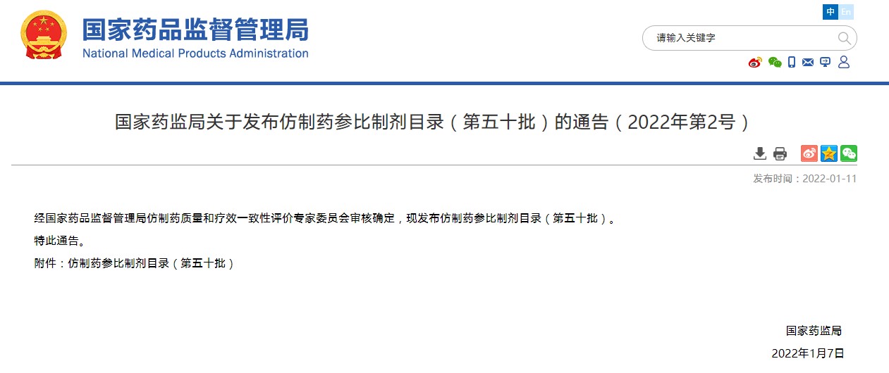國家藥監局關于發布仿制藥參比制劑目錄(第五十批)的通告(2022年第2號)