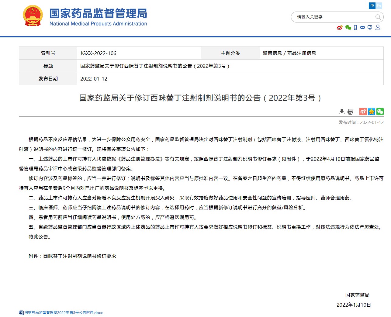 國家藥監局關于修訂西咪替丁注射制劑說明書的公告