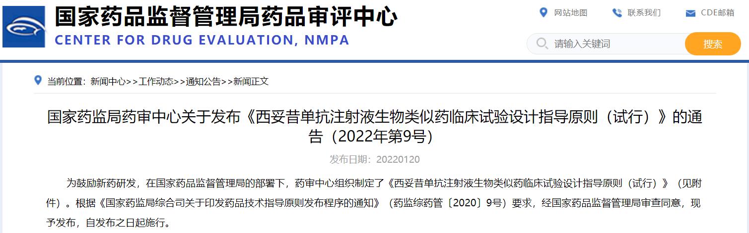 國家藥監局藥審中心關于發布《西妥昔單抗注射液生物類似藥臨床試驗設計指導原則(試行)》的通告(2022年第9號)