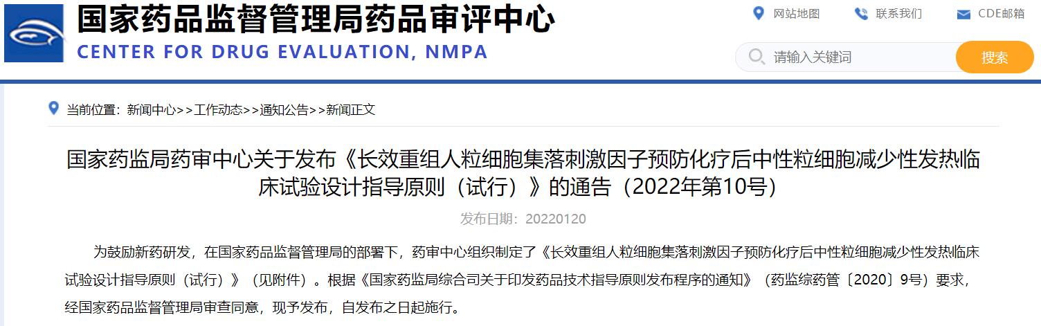 國家藥監局藥審中心關于發布《長效重組人粒細胞集落刺激因子預防化療后中性粒細胞減少性發熱臨床試驗設計指導原則(試行)》的通告(2022年第10號)