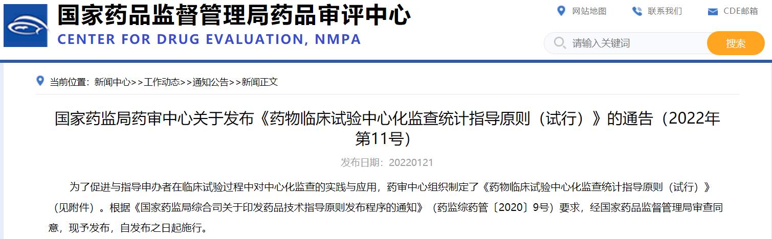 國家藥監局藥審中心關于發布《藥物臨床試驗中心化監查統計指導原則(試行)》的通告(2022年第11號)