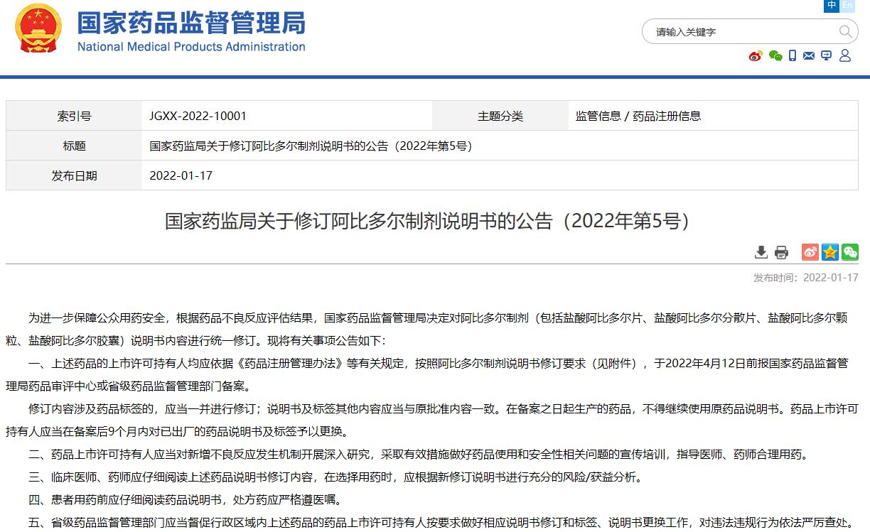 國家藥監局關于修訂阿比多爾制劑說明書的公告(2022年第5號)