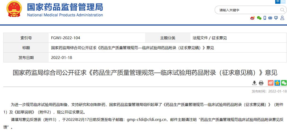國家藥監局綜合司公開征求《藥品生產質量管理規范—臨床試驗用藥品附錄(征求意見稿)》意見