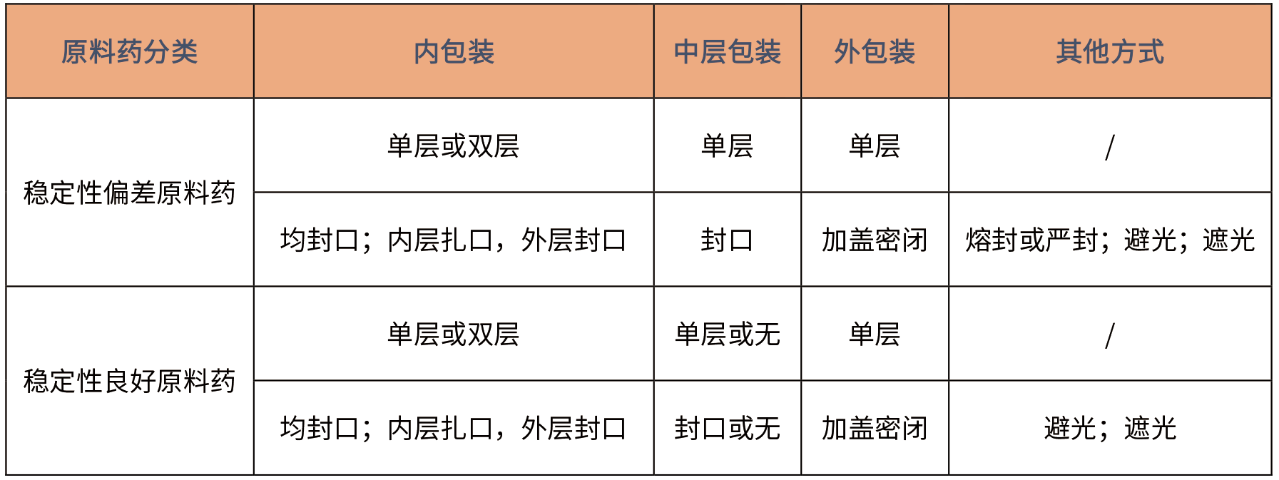 根據(jù)原料藥化學(xué)性質(zhì)穩(wěn)定性情況,包裝方式常規(guī)如下: