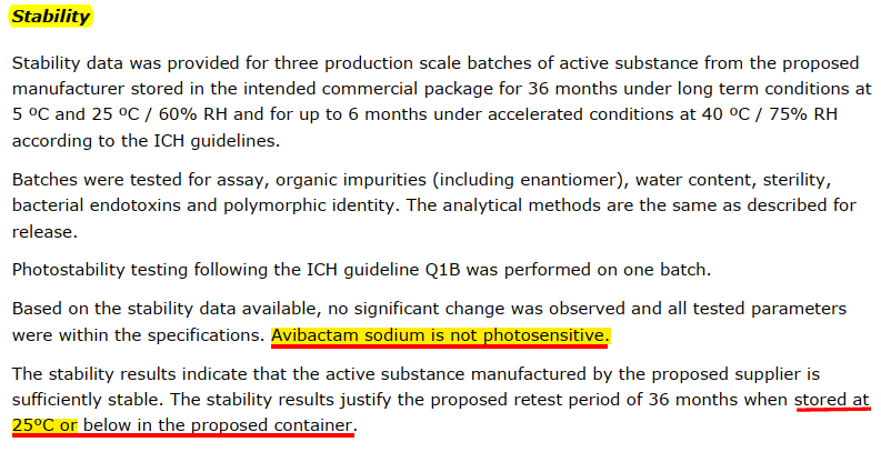 穩(wěn)定性結(jié)果表明,阿維巴坦鈉在商業(yè)化包裝條件下足夠穩(wěn)定。穩(wěn)定性結(jié)果證明,在25°C或以下條件下保存,建議復(fù)試期為36個(gè)月。