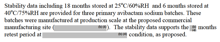穩(wěn)定性考察結(jié)果:阿維巴坦鈉采用商業(yè)化包裝在25℃/RH60%條件下放置18個(gè)月;在40℃/RH75%條件下放置6個(gè)月進(jìn)行考察。未能查詢到明確的包裝貯藏條件。