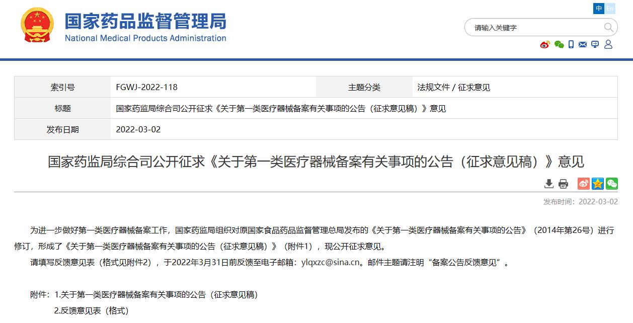 國家藥監局綜合司公開征求《關于第一類醫療器械備案有關事項的公告(征求意見稿)》意見