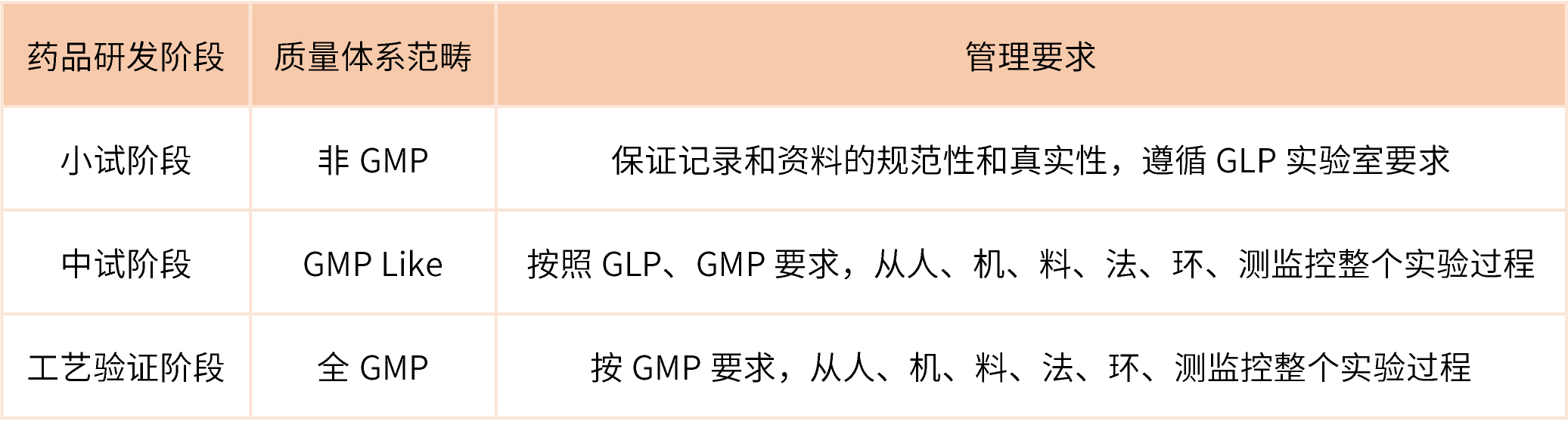藥品的不同研發(fā)階段,對質(zhì)量體系控制的要求也不同。下表對藥品不同研發(fā)階段的質(zhì)量體系范疇和管理要求進行簡述。