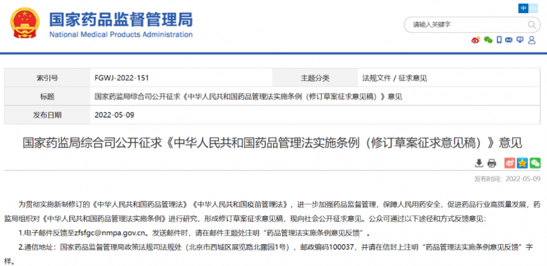 政策法規||中華人民共和國藥品管理法實施條例(修訂草案征求意見稿)(附本周法規概覽05.09-05.13)
