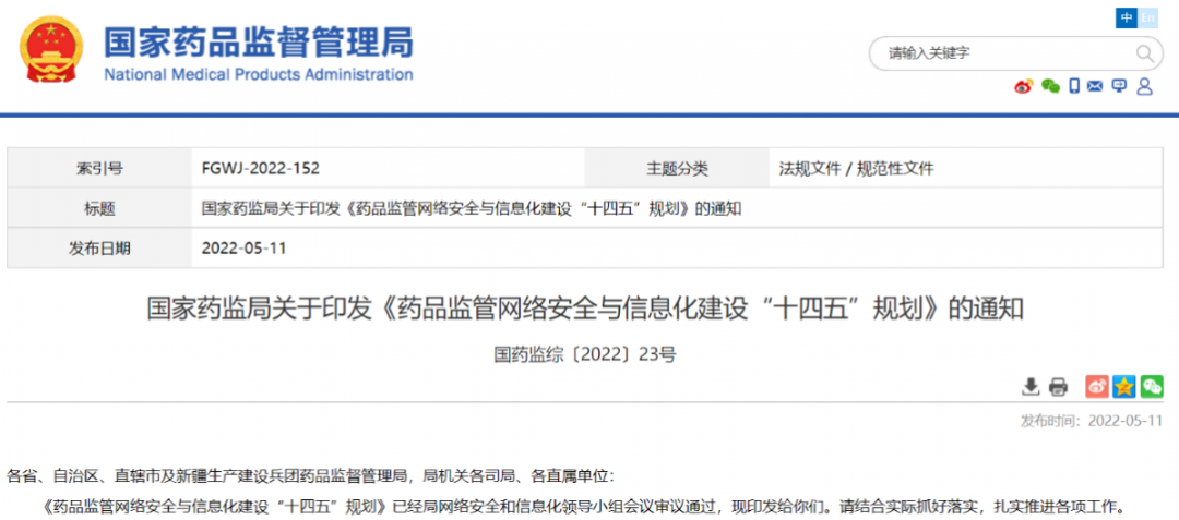 國家藥監局關于印發《藥品監管網絡安全與信息化建設“十四五”規劃》的通知