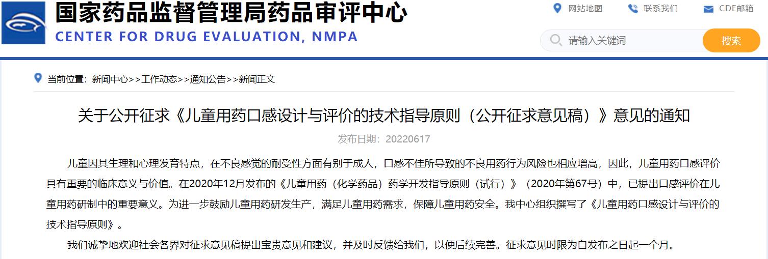 國家藥監局藥審中心關于公開征求《兒童用藥口感設計與評價的技術指導原則(公開征求意見稿)》意見的通知