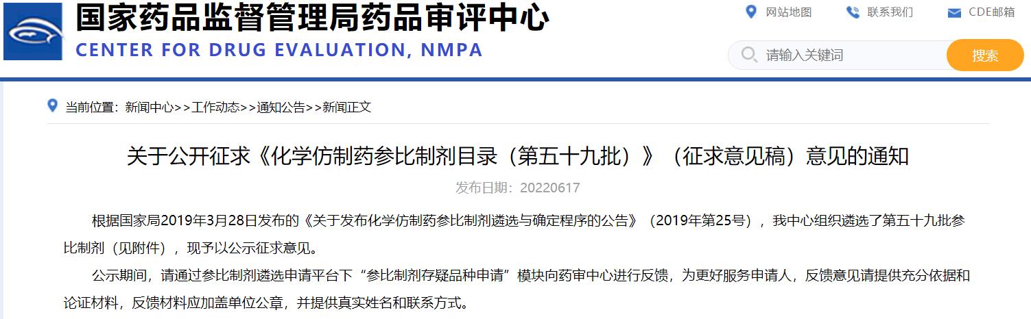 關于公開征求《化學仿制藥參比制劑目錄(第五十九批)》(征求意見稿)意見的通知
