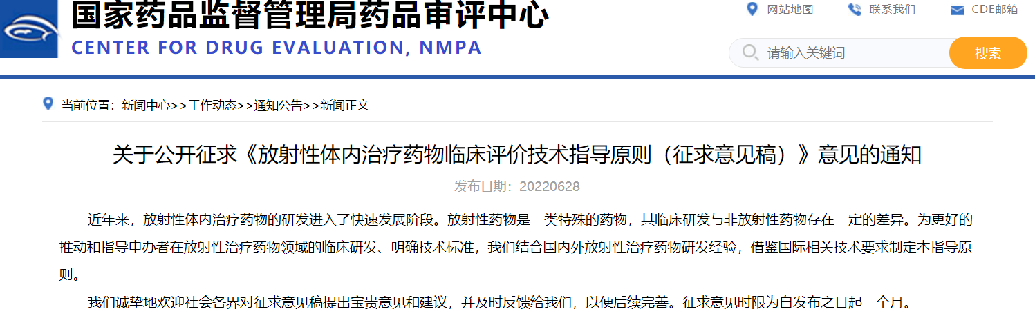 關(guān)于公開征求《放射性體內(nèi)治療藥物臨床評價技術(shù)指導原則(征求意見稿)》意見的通知