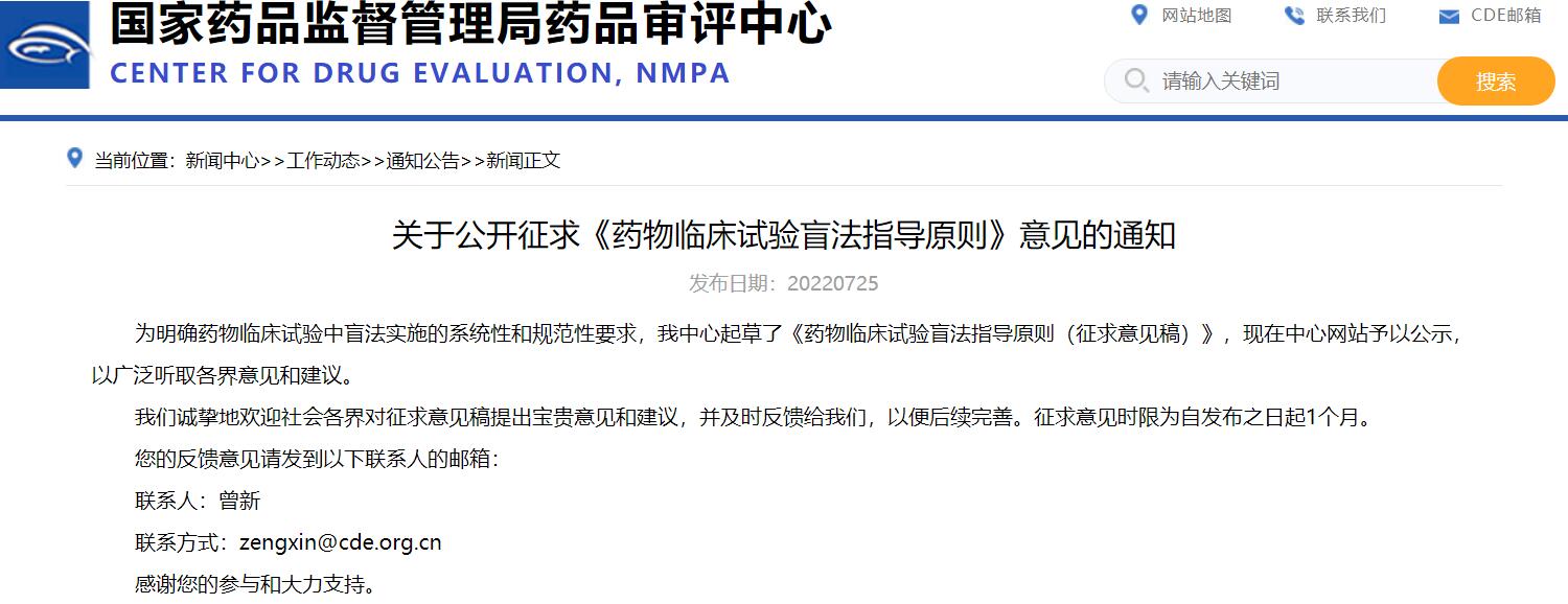 關于公開征求《藥物臨床試驗盲法指導原則》意見的通知