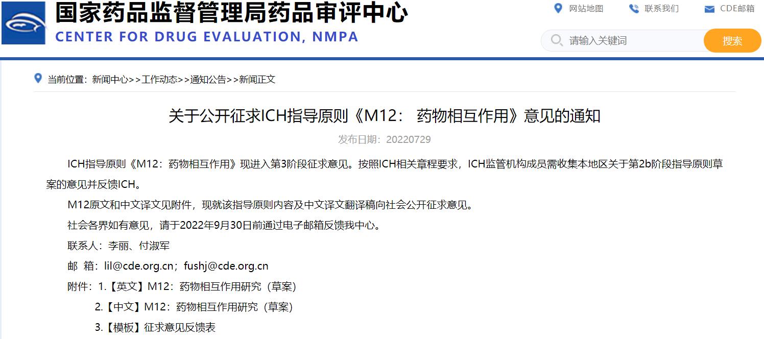 關于公開征求ICH指導原則《M12:藥物相互作用》意見的通知