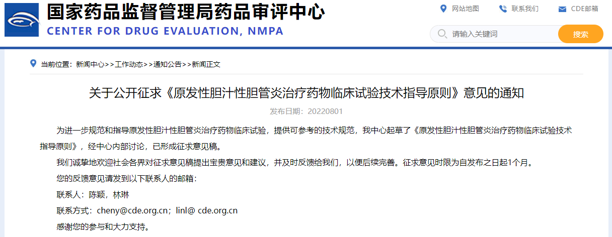 關于公開征求《原發性膽汁性膽管炎治療藥物臨床試驗技術指導原則》意見的通知