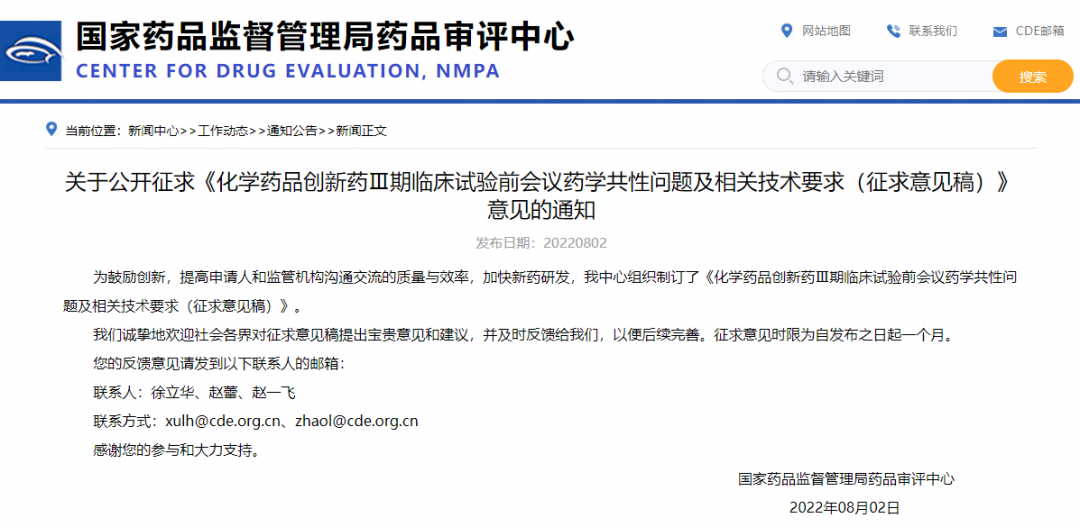 關于公開征求《化學藥品創新藥Ⅲ期臨床試驗前會議藥學共性問題及相關技術要求(征求意見稿)》意見的通知