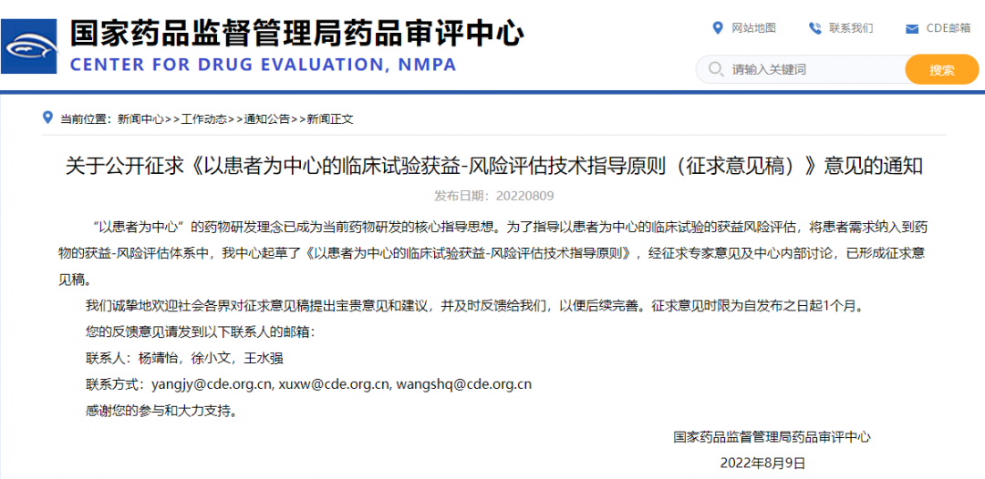 關于公開征求《以患者為中心的臨床試驗獲益-風險評估技術指導原則(征求意見稿)》意見的通知
