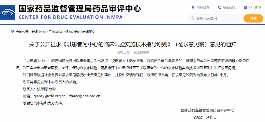關于公開征求《以患者為中心的臨床試驗實施技術指導原則》(征求意見稿)意見的通知