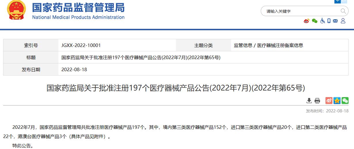 國家藥監局關于批準注冊197個醫療器械產品公告(2022年7月)(2022年第65號)