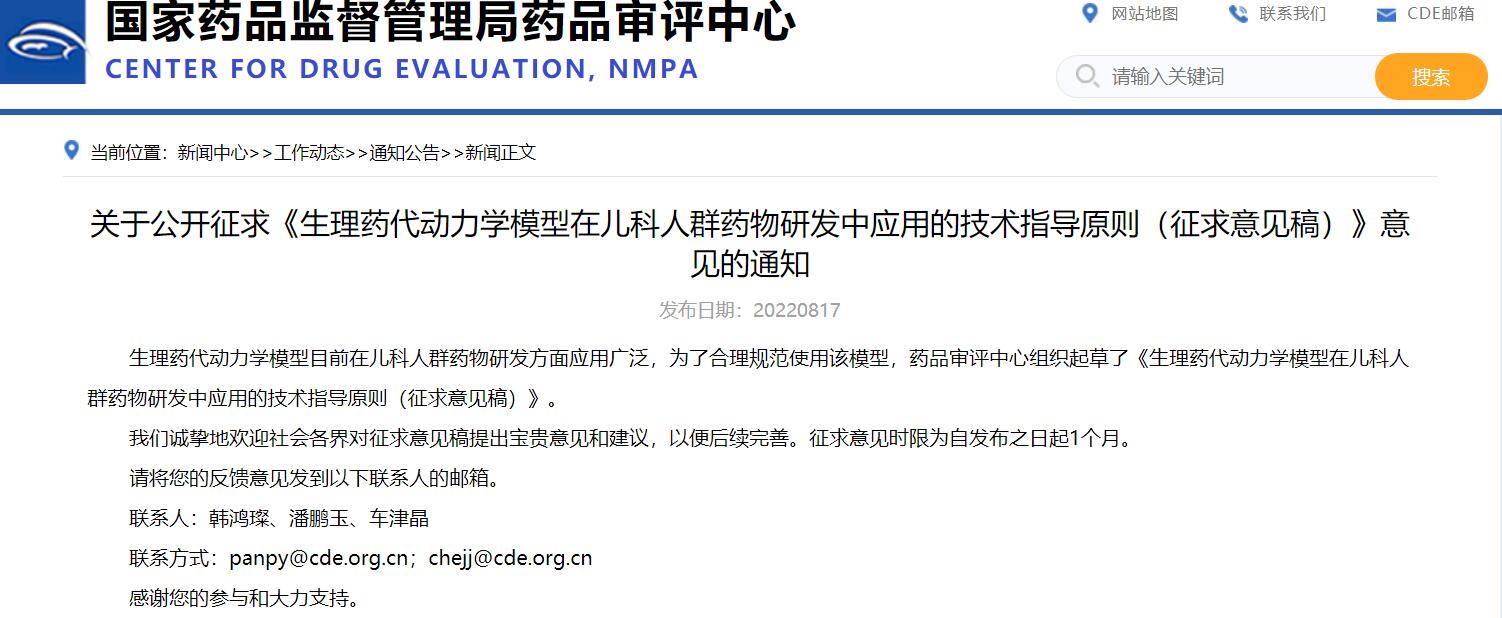 關于公開征求《生理藥代動力學模型在兒科人群藥物研發中應用的技術指導原則(征求意見稿)》意見的通知