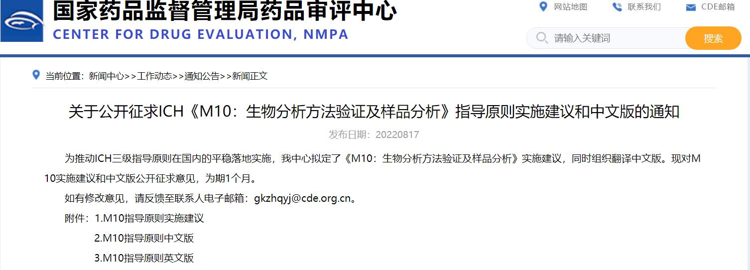 關于公開征求ICH《M10:生物分析方法驗證及樣品分析》指導原則實施建議和中文版的通知