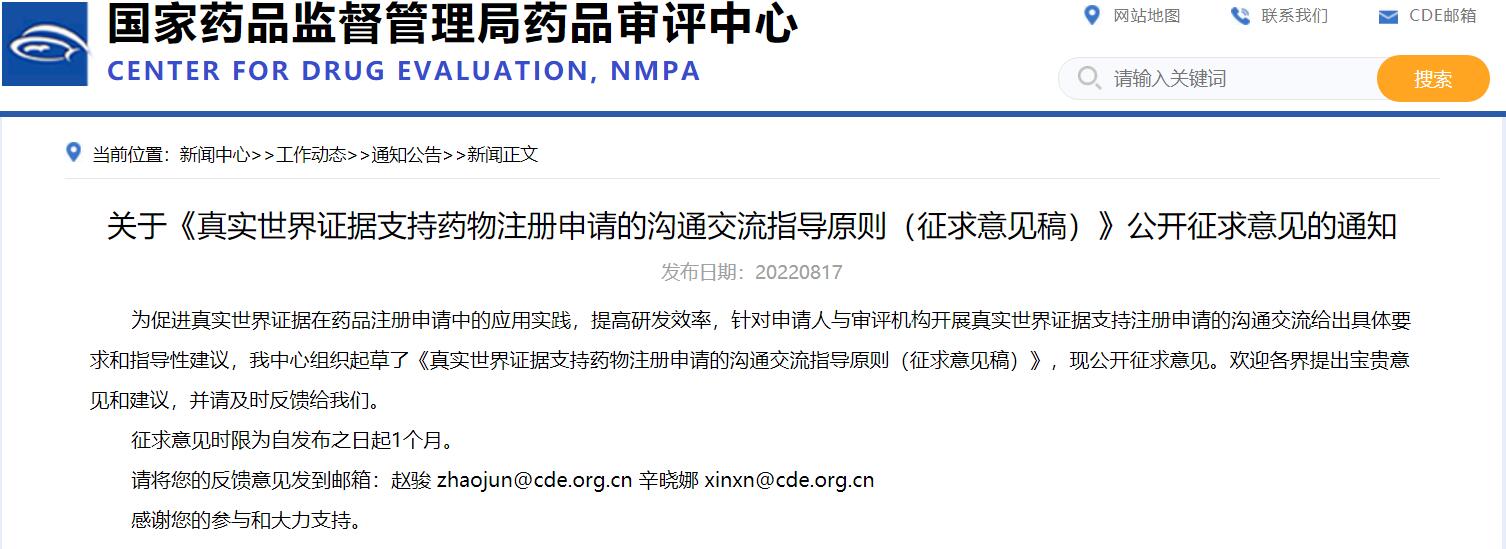 關于《真實世界證據支持藥物注冊申請的溝通交流指導原則(征求意見稿)》公開征求意見的通知
