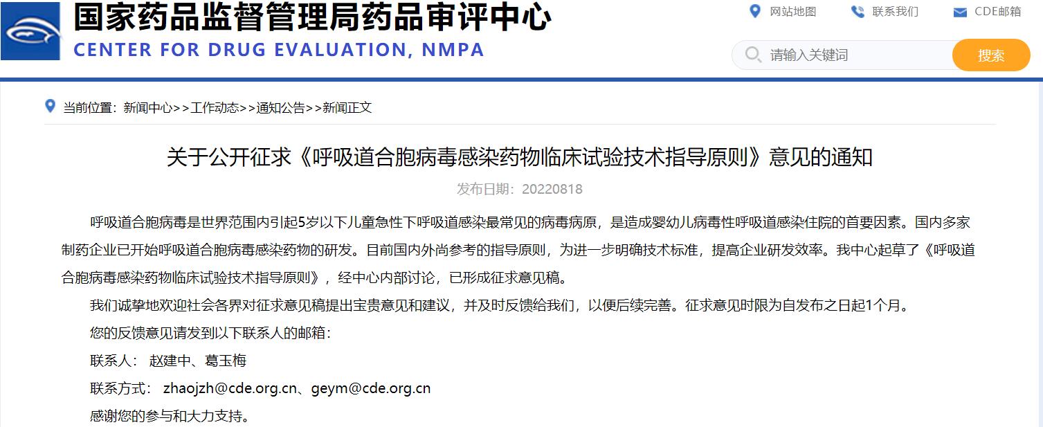 關于公開征求《呼吸道合胞病毒感染藥物臨床試驗技術指導原則》意見的通知