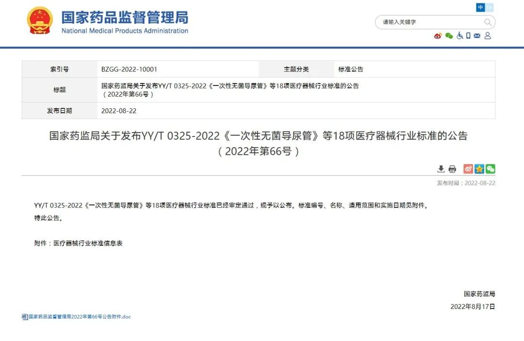 國家藥監局關于發布YY/T 0325-2022《一次性無菌導尿管》等18項醫療器械行業標準的公告