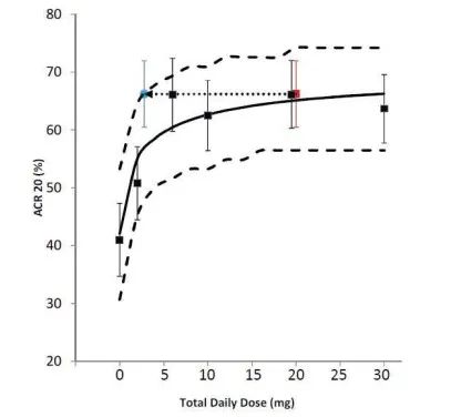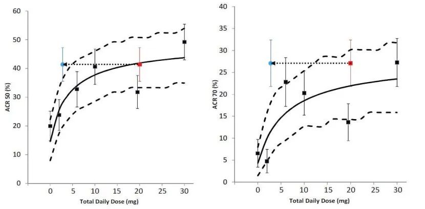 本品種PD研究中以美國風濕病學會(ACR)規定觀指標,若患者達到20%、50%或70%的緩解,即達到ACR20、ACR50或ACR70緩解。