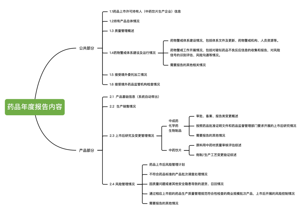 藥物警戒年度報(bào)告主要分為10部分,包括持有人信息、藥品信息、藥物警戒體系、各例藥品不良反應(yīng)報(bào)告、定期分析評(píng)估、風(fēng)險(xiǎn)評(píng)估和控制、上市后安全性研究、藥物警戒工作自評(píng)、其他說(shuō)明及附件列表。