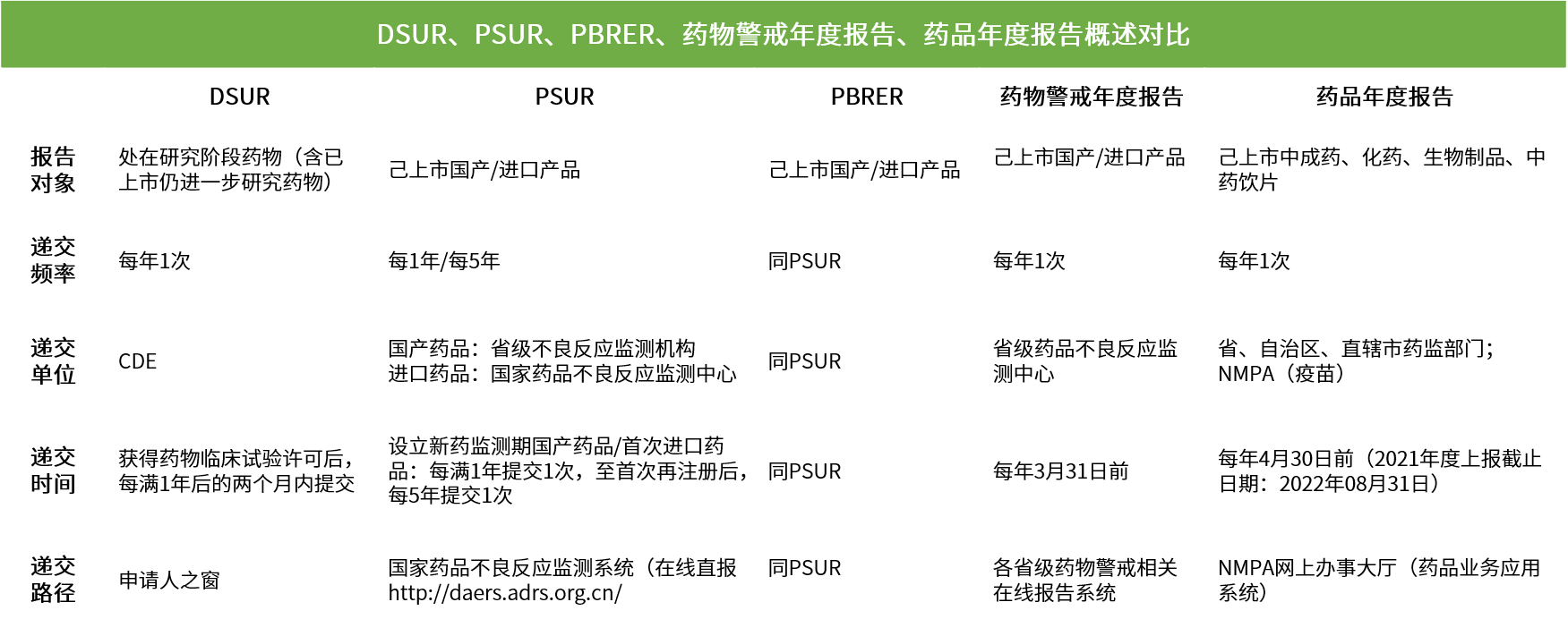 藥品上市后報(bào)告主要分為四類,定期安全性更新報(bào)告(PSUR)、定期獲益-風(fēng)險(xiǎn)評(píng)估報(bào)告(PBRER)、藥物警戒年度報(bào)告和藥品年度報(bào)告。