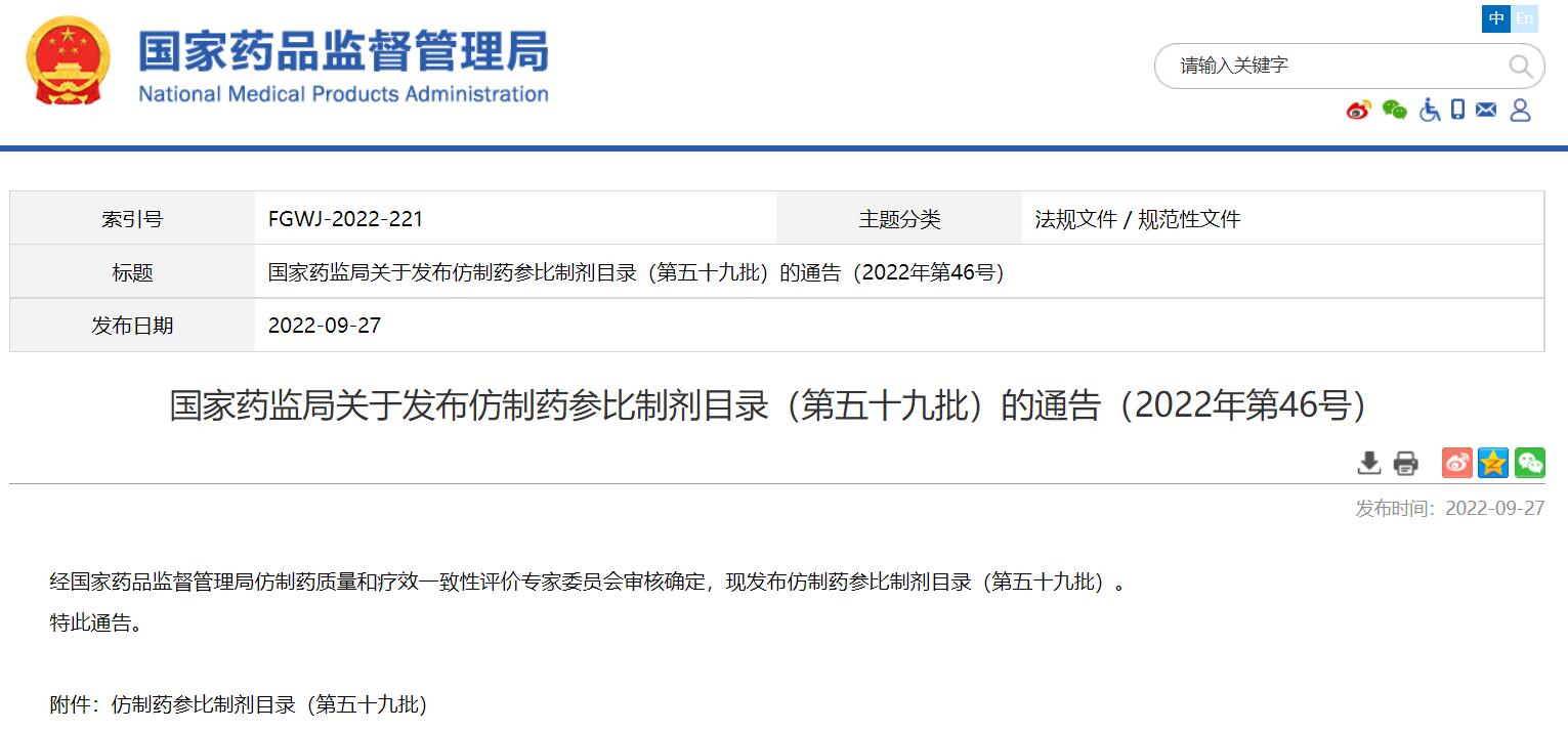 國家藥監局關于發布仿制藥參比制劑目錄(第五十九批)的通告(2022年第46號)