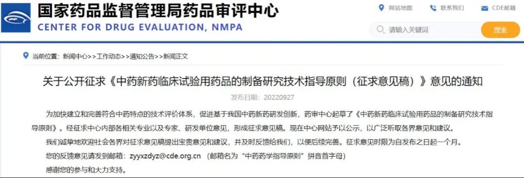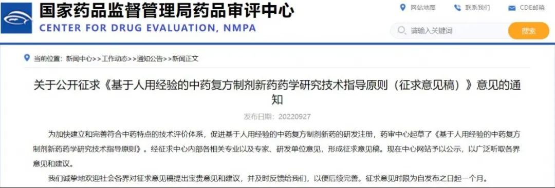 關于公開征求《基于人用經驗的中藥復方制劑新藥藥學研究技術指導原則(征求意見稿)》意見的通知