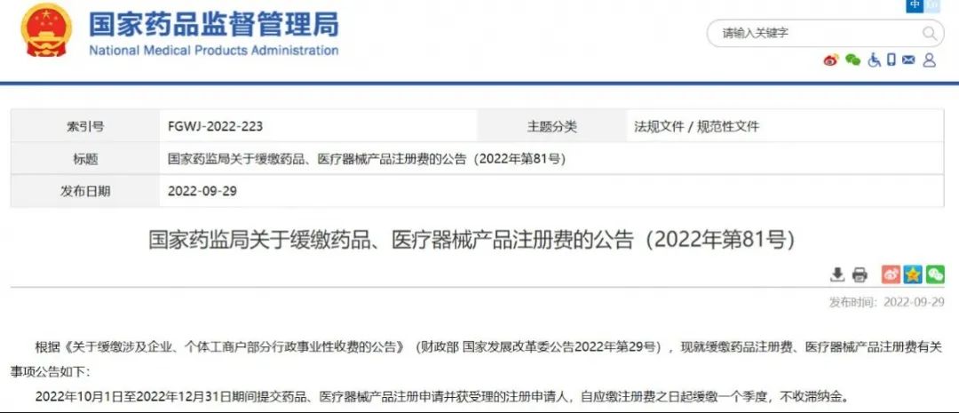 .國家藥監局關于緩繳藥品、醫療器械產品注冊費的公告(2022年第81號)