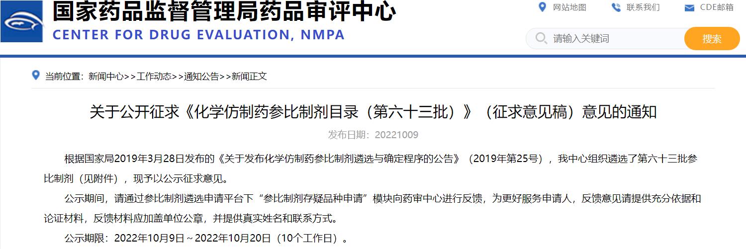 關于公開征求《化學仿制藥參比制劑目錄(第六十三批)》(征求意見稿)意見的通知