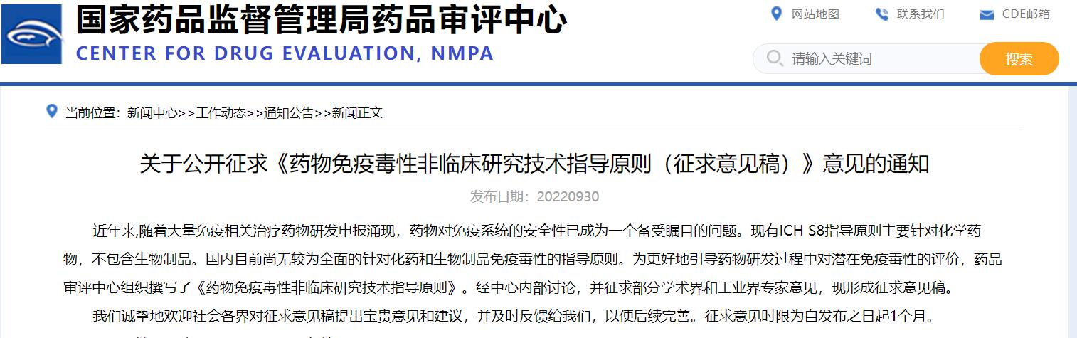 關于公開征求《藥物免疫毒性非臨床研究技術指導原則(征求意見稿)》意見的通知