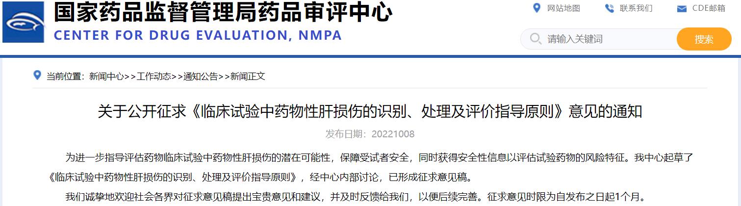關于公開征求《臨床試驗中藥物性肝損傷的識別、處理及評價指導原則》意見的通知