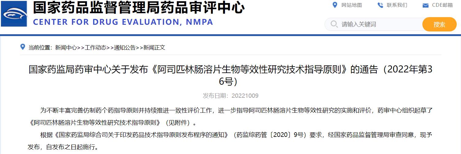 國家藥監局藥審中心關于發布《阿司匹林腸溶片生物等效性研究技術指導原則》的通告(2022年第36號)
