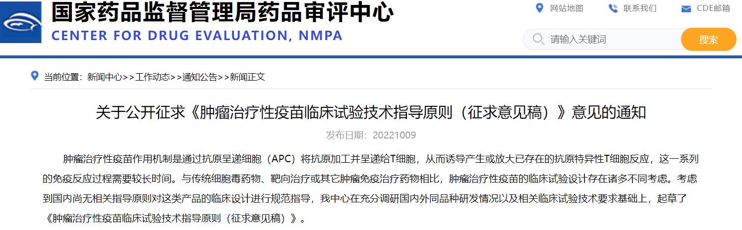 關于公開征求《腫瘤治療性疫苗臨床試驗技術指導原則(征求意見稿)》意見的通知