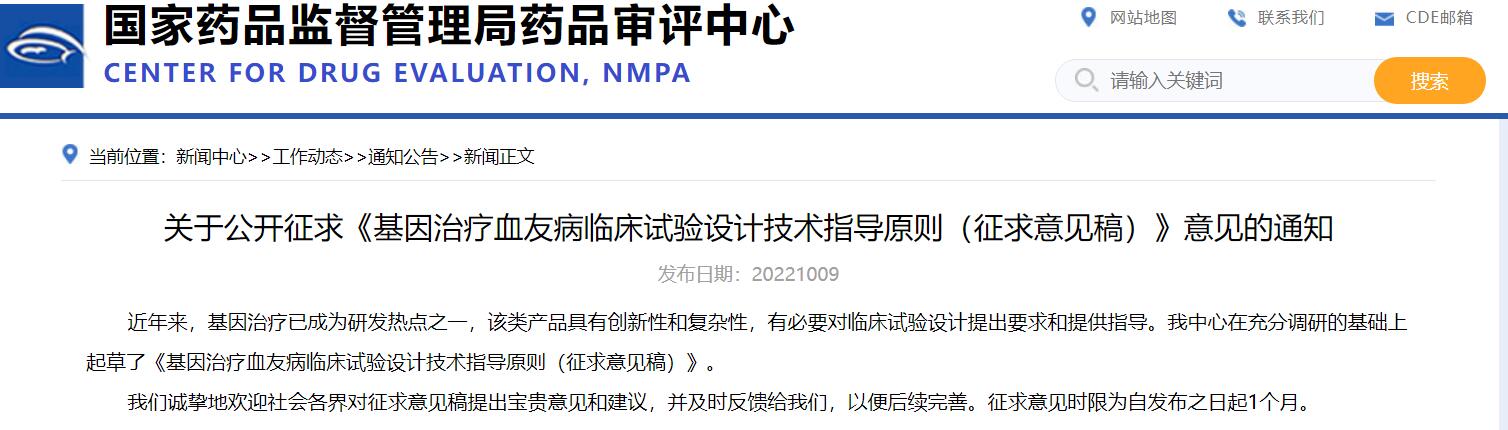 關于公開征求《基因治療血友病臨床試驗設計技術指導原則(征求意見稿)》意見的通知