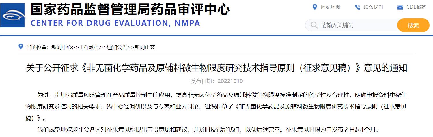 關于公開征求《非無菌化學藥品及原輔料微生物限度研究技術指導原則(征求意見稿)》意見的通知