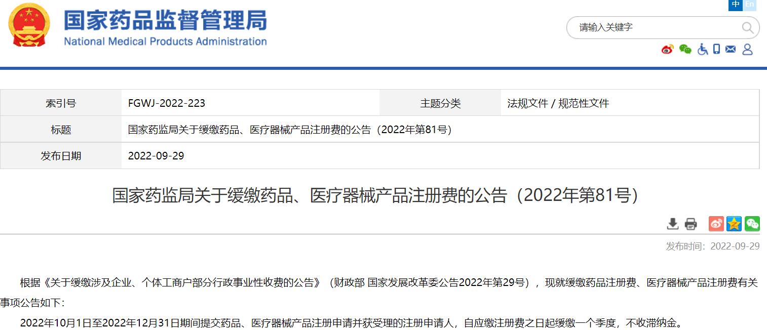國家藥監局關于緩繳藥品、醫療器械產品注冊費的公告(2022年第81號)