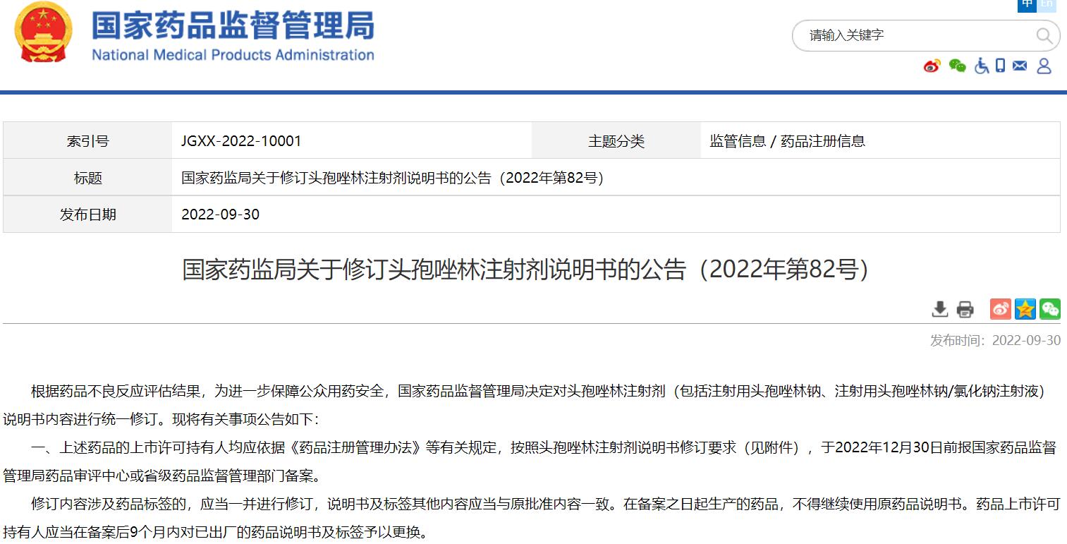 國家藥監局關于修訂頭孢唑林注射劑說明書的公告(2022年第82號)