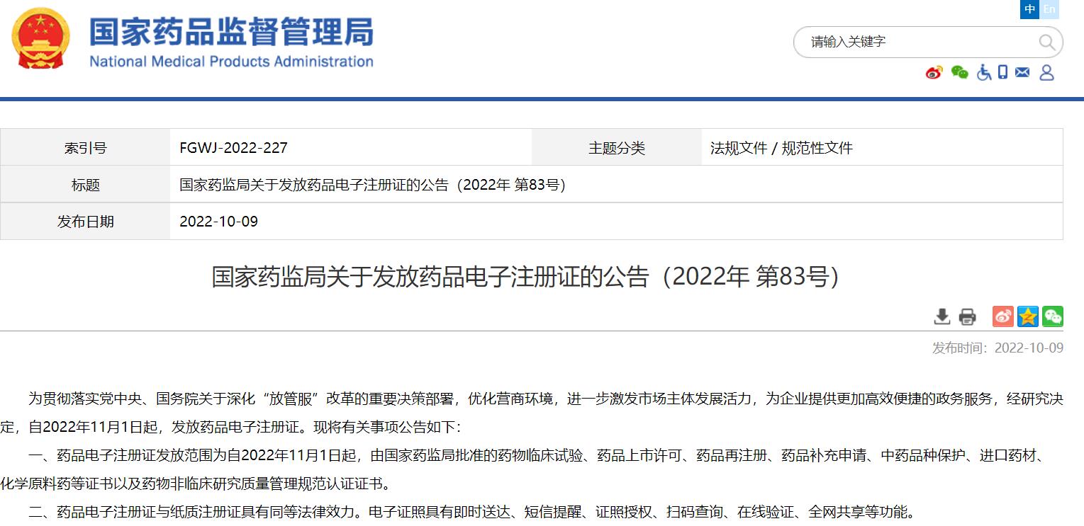 國家藥監局關于發放藥品電子注冊證的公告(2022年 第83號)