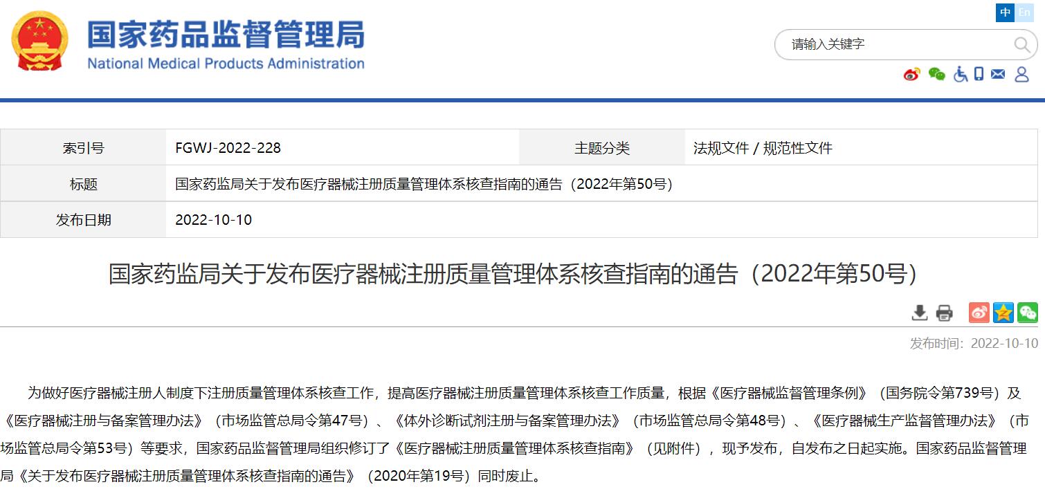 國家藥監局關于發布醫療器械注冊質量管理體系核查指南的通告(2022年第50號)