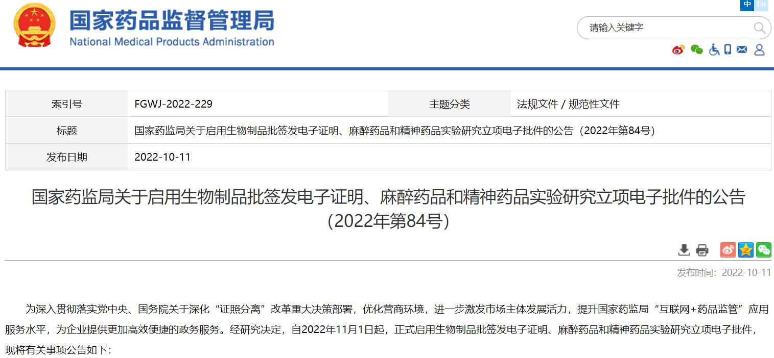 國家藥監局關于啟用生物制品批簽發電子證明、麻醉藥品和精神藥品實驗研究立項電子批件的公告(2022年第84號)