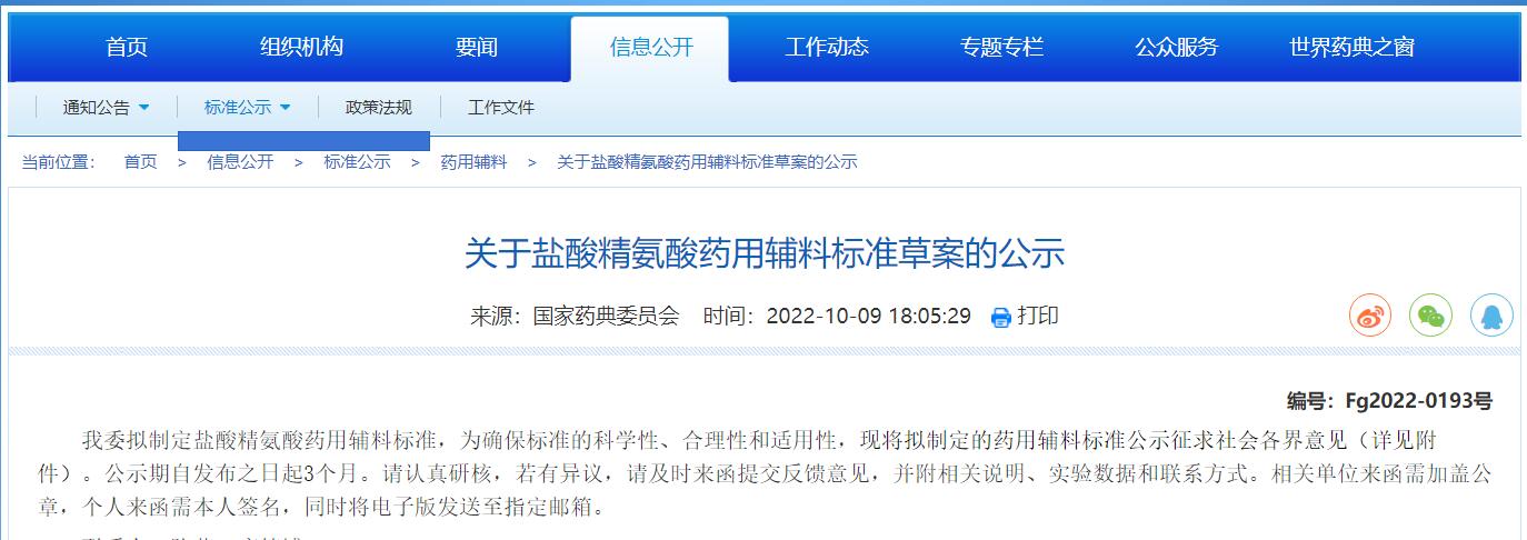 1. 本周發布鹽酸精氨酸藥用輔料標準草案的公示。