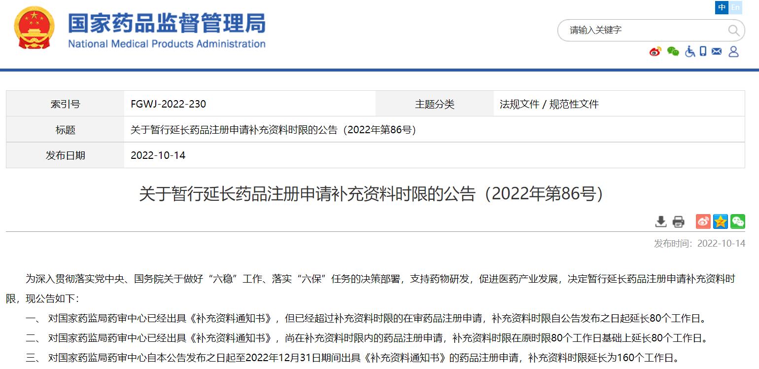 關于暫行延長藥品注冊申請補充資料時限的公告(2022年第86號)